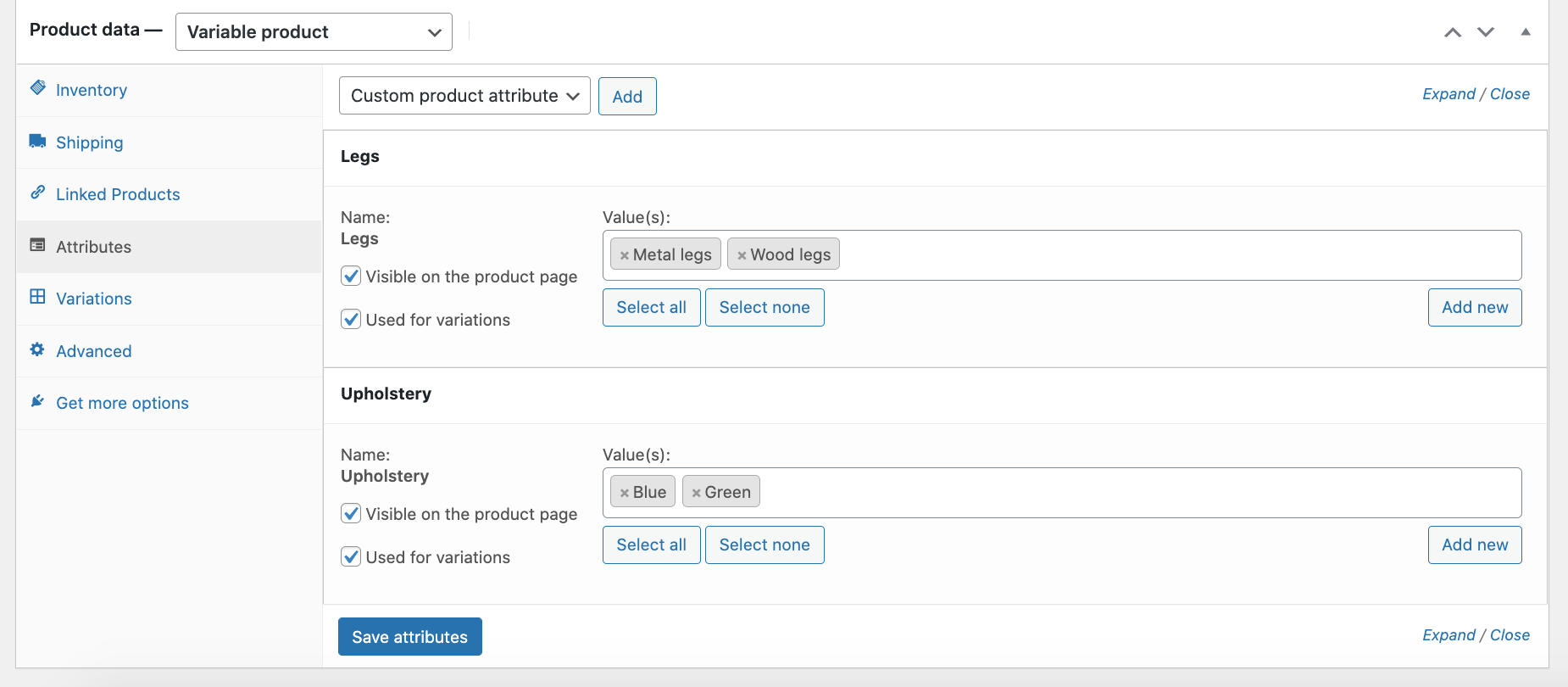 In the attributes menu add the global attributes that we’ve created before, Legs and Upholstery. Make sure to select the option Used for variations. You also need to select the terms available for this product from the terms list, for this case Metal Legs and Wood Legs for the Legs and Blue and Green for the Upholstery.